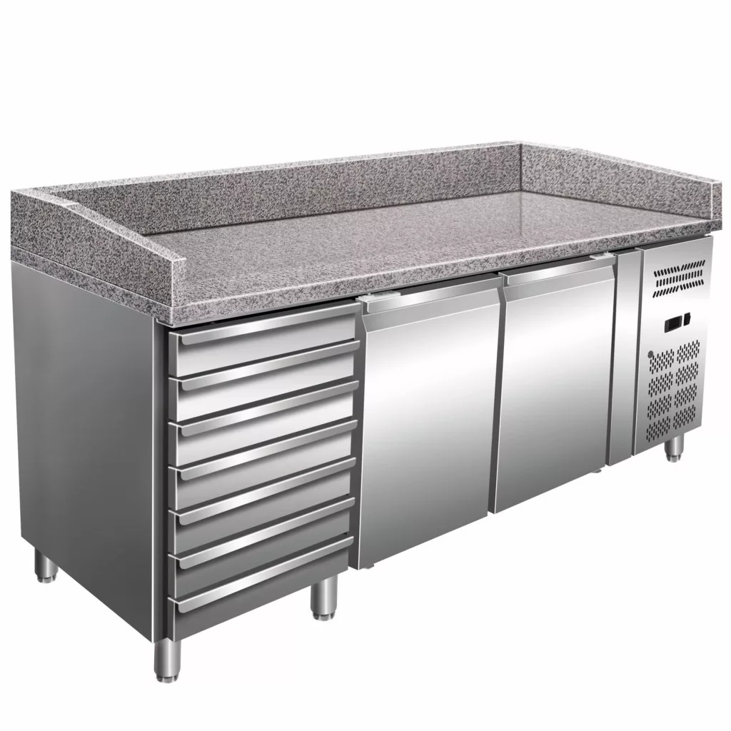 Ez a praktikus pizzapult ideális választás éttermeknek, szállodák konyháinak és más vendéglátóipari egységeknek, ahol sok pizzát készítenek, így fontos a gyorsaság és az effektív munkavégzés. A pizzapult strapabíró rozsdamentes acélból készült és gránit munkalappal rendelkezik, Ennen köszönhetően könnyen ellenáll a konyhai igénybevételeknek és könnyen tisztítható. A pizzapult felső részén gránit munkalap található így megkönnyíti a pizzakészítés folyamatát. Az asztal alsó részén elhelyezett hűtőegység pedig gondoskodik arról, hogy az összes alapanyag és késztermék megfelelő hőmérsékleten tartásáról. Az egyszerű hozzáférhetőséget biztosítja még a munkaasztal két nagy ajtaja és a fiókok, melyen keresztül könnyű az ételek ki és bepakolása a hűtött munkaasztalba legyen szó akár kicsi akár nagyobb méretű hozzávalókról.